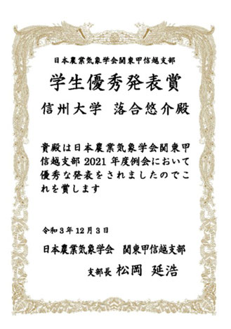 2021/12/16 2021年度関東甲信越支部例会における学生優秀発表賞受賞者の報告 (2021年12月) 2021年度日本農業気象学会関東甲信越支部例会において、以下の方が学生優秀発表賞を受賞しました。 落合悠介さん(信州大学) 「森林火災による土地被覆変化が対流性降雨の特性に与える影響」 tagPlaceholderカテゴリ: 2021年度